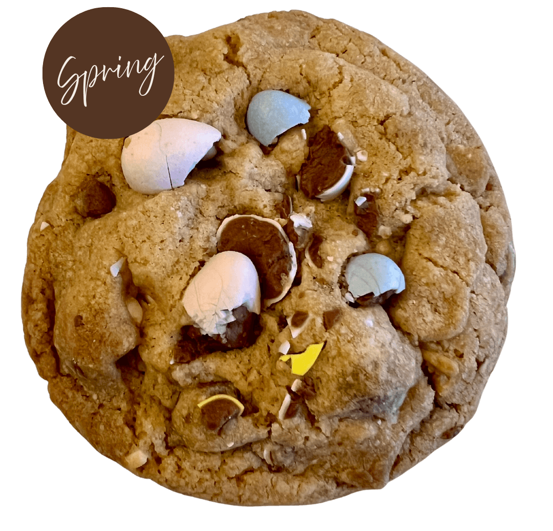Brown butter baked into a rich, golden cookie loaded with gooey Cadbury Creme Egg pieces. Crispy edges, soft center, and pockets of creamy milk chocolate in every bite. A nostalgic spring favorite with a decadent twist.