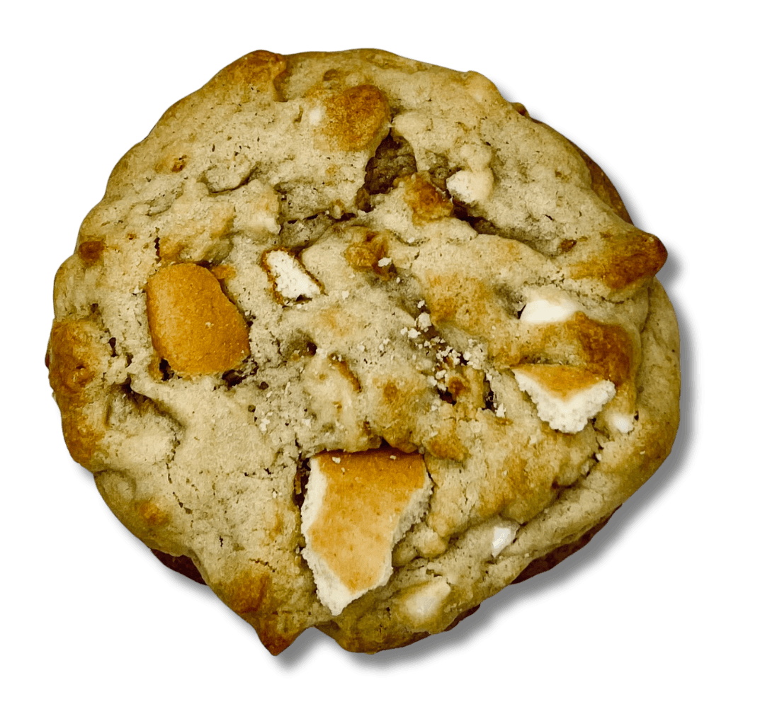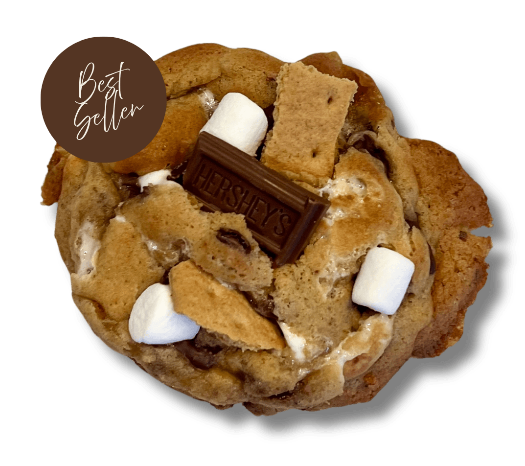 A gooey chocolate chip cookie loaded with mini marshmallows, graham cracker pieces, and topped with a classic Hershey’s square. All the campfire flavors you love, no fire required!